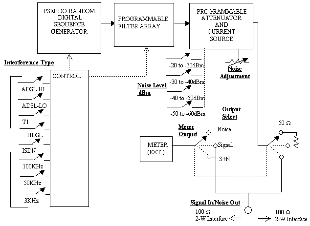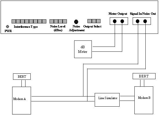General Product Application The Telebyte Model 456 Loop Interference Simulator generates narrow and broadband noise of various shapes. These can then be introduced into a two-wire transmission path between two modems. By adjusting the level of noise power relative to modem signal power levels, the effect of the impairment can be controlled. For different signal-to-noise level settings, data such as error rate can be measured and recorded. The performance of the modems can then be evaluated and optimized. Depending on the type of modem, a noise shape is selected that would result in interference in the band of the modems' operation. This product has a variety of noise shapes to select from. Refer to the manual for a detailed theory of operation. Bit Error rate MeasurementsFigure 1 illustrates a simplified typical configuration used for making error-rate measurements. Two modems are connected to each other using a two-wire line simulator Note 1. The simulator can be set for various lengths, depending on the nature of the tests. This is beyond the scope of this document. Typically the longer the length of the line, the higher the tendency for bit errors, since longer lines result in a lower level of received signal. A BERT (Bit Error Rate Test) Set at each end generates a unique data test pattern for transmission towards the opposite end and detects and displays errors of the received data. The noise source must be injected at the junction of the modem and the two-wire line simulator without disturbing modem signal levels. This is accomplished by using a noise generator having a high-impedance (current source) output. In order to set up signal-to-noise ratios so error-rate data can be recorded, the signal and the noise must be measured independently. The Telebyte Model 456 Loop Interference Simulator accomplishes all of these tasks. ![]() Note 1: In some cases it may be desired to use two line simulators so that noise can be inserted in the center between the simulators thus simulating a symmetrical network. Telebyte's series of Wire Line Simulators - Model 454, 455, and the 457 - are ideal for this type of testing. Figure 2 illustrates a block diagram of the Model 456 Loop Interference Simulator. The theory of the internal operation is explained in the reference manual. The controls and connections function as follows (refer to Figure 2 for each step):