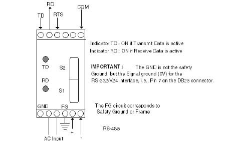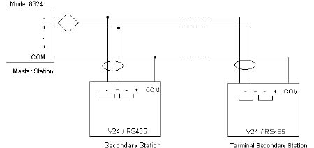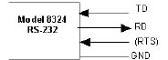 The intermediate secondary stations can use a balancing termination by connecting a "pull-up" resistor to the negative line side of the bus and a "pull-down" resistor to the positive side of the bus, thereby forcing a zero condition on the line. The secondary station transmission circuits present the characteristic of operating in three-state mode, a high impedance state during the idle period (i.e., period of non data transfer). The sending of data from one station can be initiated by the incoming RTS signal (Pin 4) on the RS-232 side going active, or by internal generation of a data-received signal on the RS-232 side. This second method, controlled by a microprocessor, enables the use of the Model 8324 with a simple three-wire (TD, RD and GND) RS-232 connection and XON/XOFF flow control. 2.3 RS-485 HDX operation modeThe lack of a control circuit on the RS-232 side requires that the Model 8324 take control