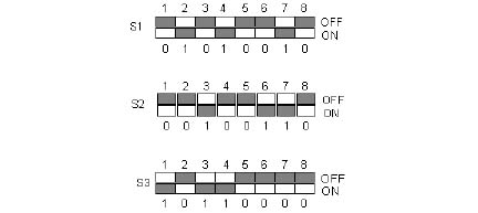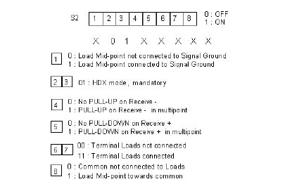 4.3 DIP-Switch S3Generally the use of an RS-485 interface implies controlling the half-duplex operation mode. The DIP-switch block S1 enables the selection of the operating mode and data transmission characteristics needed by the microprocessor when detecting and managing the active phases of the RS-485 transceiver (refer to section 2.3, "RS-485 HDX Operation Mode"). Transmitter Configuration S3-1 to S3-3 Baud Rate, S3-4 to S3-5 Byte Format | ||||||||||||||||||||||||||||||||||||