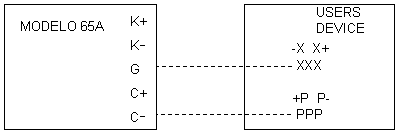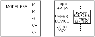 Las coneciones "K" en el convertidor son las salidas para el bucle. K+ es el colector del transistor y el K- es el emi-sor del transistor. En el modo PASIVO, el transistor esta flotando; el usuario tiene que suplir la corriente para el bu-cle. En el modo Activo el Modelo 65A suple un voltaje positivo (aproximadamente +12 Voltios) por una resistencia de 560 Ohms, ½ Vatio, al punto K+, colector, y la corriente esta disponible en el punto K-.
